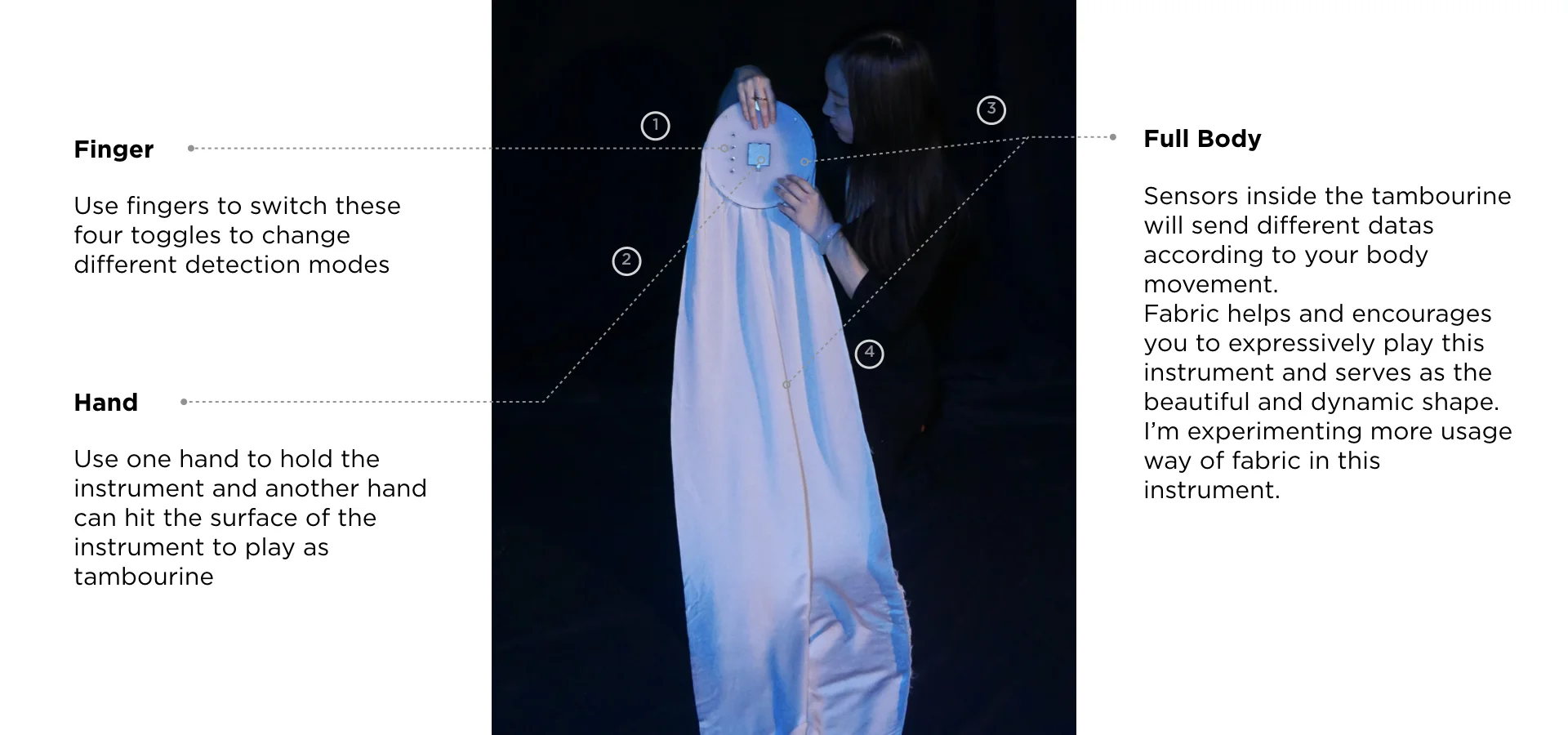 This musical instrument generates sound by detecting different movements of the performer. It has four different modes selected by toggling the switches on the instrument interface. Each mode has different movement detection methods, generating various sound and music. Moreover, it can be played as Tambourine. As for the music in my performance, it’s all played by myself lively, consisting of different sound triggered and changed by performers’ gestures and melody composed myself.